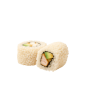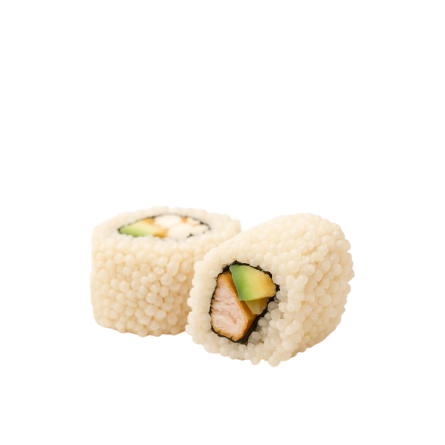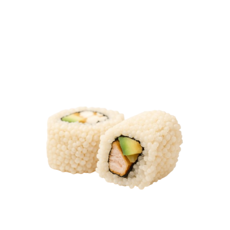 Un California roll au riz soufflé composé de poulet pané de mayo et d'avocat