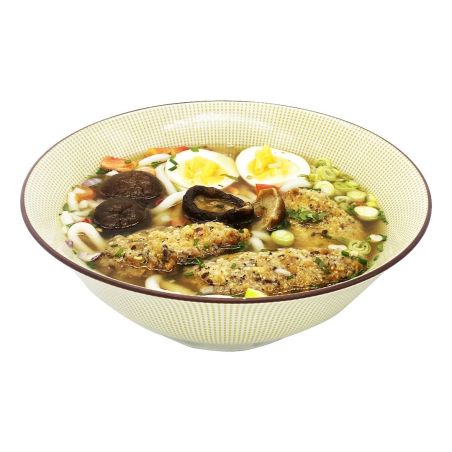 Une Soupe composée de pates Japonaises Udon, de coriandre, poivrons rouge, cebette, ciboulette et échalotte, un peu de piments notre poulet pané aux graines, un œuf mariné dans la sauce soja et des champignons shitaké
