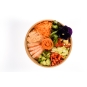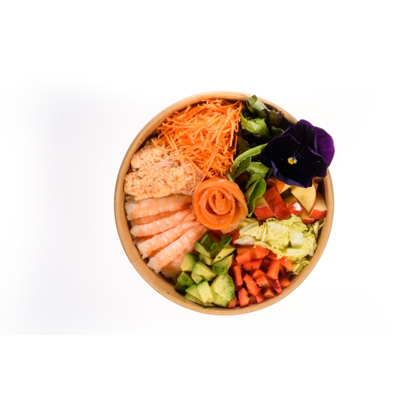 Un délicieux Poke au Crabe, crevette et saumon fumé accompagné de carottes edamame pomme poivron rouge choux chinois avocat, salade et riz