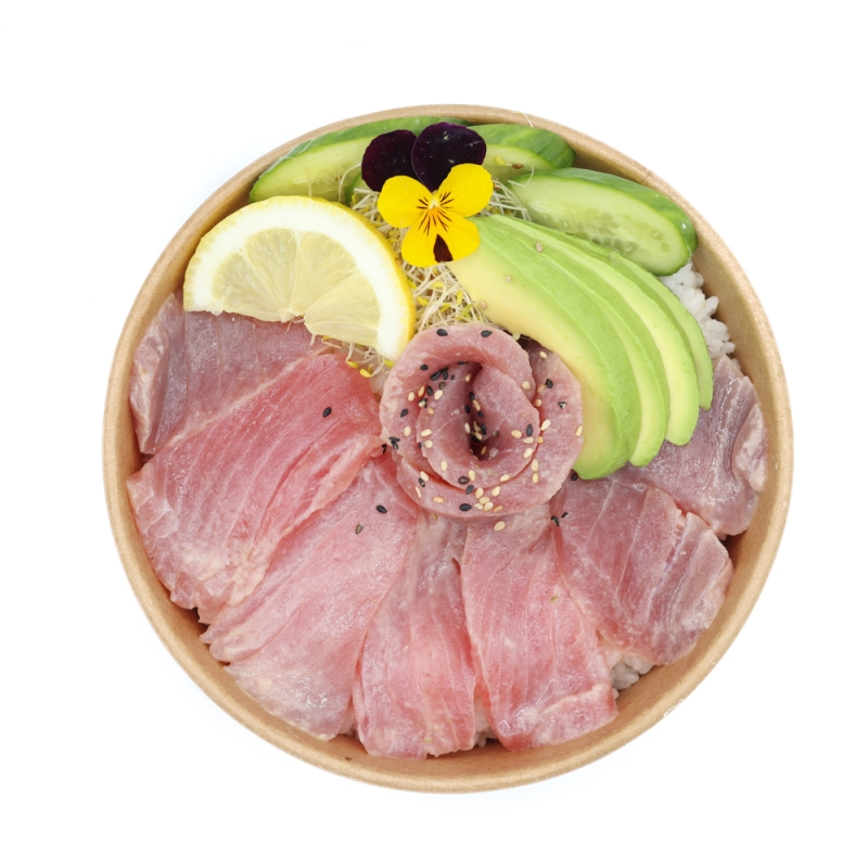Bol de riz vinaigré recouvert de sashimis de thon marinés dans du jus de Yuzu, accompagnées de fines tranches d'avocat de concombre et de graines de sesames...