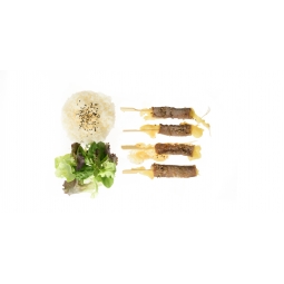 Plateau de 4 brochettes boeuf fromage servies avec du riz, de...